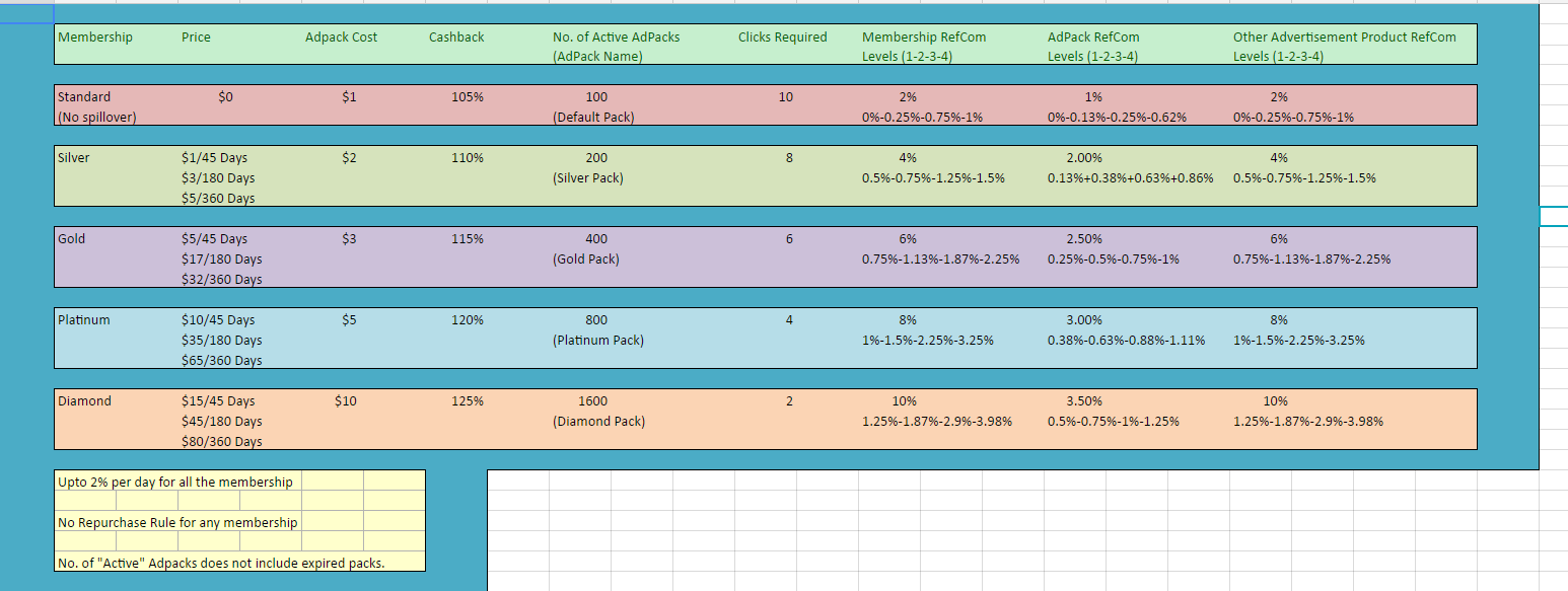 No Membership:costo per ogni ad pack 0.01 btc - potete comprare fino a 100 ad packs - avrete 5.000 crediti per pubblicizzare i vostri siti